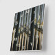 Römische Zahlen in weißer Schrift auf silber geschlagenen Metallorgel-Rohren, mit zarten Farben von Gold und Grün reflektiert im Metall. Dies ist eine Version für eine quadratische Uhr.