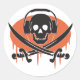 Das Design des Pirate DJ besteht aus einem Skull mit Kopfhörern und gekreuzten Schwertern über tropfende orangefarbene Farbe. Dedizierte die Piraten DJs, die die Musik lebendig behielt.