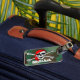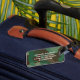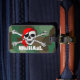 Auf dem grünen Hintergrund der Camouflage sitzt ein Piratenschädel mit roter Bandanna und Augenklappe. Sein Name ist in einem bedrückten weißen Schriftart. Name und Adresse auf der Rückseite.
