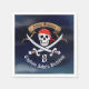 Passen Sie den Text für Ihre Veranstaltung an. Handgezeichnete Piratenflagge mit zwei gekreuzten Schwertern. Handgezeichneter nebeliger Himmelshintergrund zur Einladung.