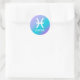 Ein Set runder Aufkleber mit dem Astrologiesymbol für Pisces über einem blauen und lila Gradientenhintergrund. Für jemanden, dessen Geburtstag zwischen dem 19. Februar und dem 20. März ist.