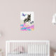 Dies ist eine skurrile Aquarellbilder eines schwarzen Grubenbullen Hundes, der aus den Regenbogenfarben der Wolken springt. Hübsche Schmetterlinge fliegen um den Hund herum. Pop-Kunstdesign für Hundefreunde.