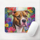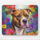 Ein brauner und weißer Pitbull-Hund mit ernstzunehmendem Ausdruck wird in einem lebendigen Blumengarten dargestellt. Der Kopf und die Schultern des Hundes bilden den Mittelpunkt, umgeben von einer Fülle von bunten Blüten. Die Blume sind in Rottopfmuster, Gelbtönen und Rosa-, lila- und Blautönen gehalten. Der Hintergrund ist eine weiche, verschwommene Aquarellspülung von Blau und Grün, die einen sonnigen Tag nahe legt. Ideal für Grubenliebhaber.