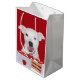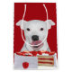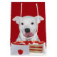 Weißer pitbull Terrier leckt seine Lippen über einem Erdbeerkuchen, vermutlich ein Geburtstagskuchen aber könnte jede mögliche Partygelegenheitshundeliebhaber-Geschenktasche sein