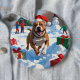 Ein kräftiger und spielerischer Pitbull schlängelt durch die verschneite Landschaft und trägt einen festlichen roten Weihnachtshut voll von Urlaubsstimmung. Die fröhliche Winterlandschaft spiegelt die Energie, Loyalität und den Charme dieser geliebten Rasse wider, die den Zauber der Saison mit der Persönlichkeit des Pitbull vermischt.