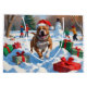Ein kräftiger und spielerischer Pitbull schlängelt durch die verschneite Landschaft und trägt einen festlichen roten Weihnachtshut voll von Urlaubsstimmung. Die fröhliche Winterlandschaft spiegelt die Energie, Loyalität und den Charme dieser geliebten Rasse wider, die den Zauber der Saison mit der Persönlichkeit des Pitbull vermischt.