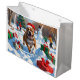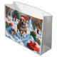 Pitbull Hund läuft im Schnee mit Weihnachtshut Große Geschenktüte