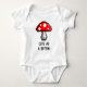 Eine Pixelkunst fliegt einen agarischen Pilz. Die Wörter lesen "Niedlich als Knopf", was ein Wortspiel ist, das auf Knöpfen basiert, die Pilze sind.