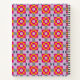 Die fuchsia, gelbe und lila Pixel erzeugen einen Hintergrund mit rhomboiden Formen abwechselnd mit konzentrischen Quadraten und Kreisen. Auf der oberen Ebene gibt es Reihen von Quadraten mit pixeliger Dekoration. Die Quadrate sehen aus wie Blume in Pixelkunst.