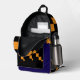 Ein trendiger Rucksack mit einem auffallend pixelförmigen geometrischen Muster in Orange, Schwarz und tiefblau, kombiniert mit praktischer Eleganz. Ideal für Schule, Reisen oder den Alltag.