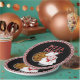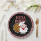 Pizza Party-ist ein digitales Grafikdesign. Koch Italiano steht an der unteren rechten Ecke. Eine Pizza mit Pfefferoni auf der Pfanne sitzt direkt vor den links. Dekorativer Text in Rot und Weiß lautet: PIZZA PARTY. Der Hintergrund in der Mitte ist schwarz. Der Plattenrand ist ein Allover-Hintergrund-Karo-Muster auf weißen, roten und schwarzen Quadraten. Der innere Rand ist rot und der äußere Rand schwarz. Dieses Design ist mit verschiedenen Hintergrund- und Randfarben erhältlich. Die Einladungen und das Party werden koordiniert.