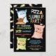 Kawaii inspirierte Pizza-Schlummerschlummer Party-Sleepover Geburtstagsfeier Einladungen. Zeigt 3 niedliche Kawaii Kissen in Pastellfarben und lustige Schriftart auf schwarzem Hintergrund mit Pizza und fliegenden Federn aus den Kissen.