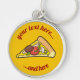 Pizzalschnitt Cartoon Illustration auf gelbem Hintergrund. Zwei benutzerdefinierte Textfelder im Kreis.
