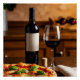 A mouthwatering still life poster showing a delicious pizza topped with mozzarella, pepperoni, tomato sauce and basil on wooden board. Accompanied by a bottle of red wine and a filled glass, wir haben Rustic wooden table. Perfekt kitchen or dining room wall art for lovers of Italian food and cozy meals.
