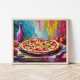 Ein lustiges und spielerisches, modernes Bild einer Pizza mit strukturierten abstrakten Pinselstrichen in kräftigen Farben wie Rosa, Gelb und Blau. Die kühnen Farben und das lebendige Pinsel verleihen der Pizza ein skurriles, energetisches Ambiente, das Essensbilder mit kreativem, zeitgenössischem Kunststil verbindet. Dieses sonderbare Werk vereint Pop und abstrakten Expressionismus und fügt einer beliebigen Umgebung eine Touch Spaß und Spaß hinzu.