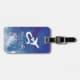 A simple and modern design to identify your belongings when traveling around the world. White airplane printed over watercolor blue background with your name and initials at front side, with custom quote 'here we go again'... with additional information and the map of the world, at the back side.
