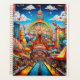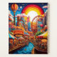 lebhafte und farbenfrohe Parklandschaft. In der Mitte befindet sich ein großes Riesenrad mit dem Wort "SKYLANE". Das Riesenrad ist von verschiedenen skurrilen Strukturen umgeben, darunter Türme und Zelte mit Fahnen. Der Himmel ist voll von Heißluftballons und flauschigen Wolken. Auf den Wegen wird eine Menge Besucher gesehen, die die festliche Umgebung genießen. Das Ambiente ist eine aufregende und unterhaltsame Atmosphäre, typisch für einen Messe- oder Themenpark.