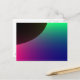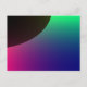 Diese Postkarte zeigt ein digital gestaltetes Bild, das dem Halbmond eines dunklen Planeten ähnelt, umgeben von einem kosmischen Polarlicht aus Grün, Blau, lila und Rosa.