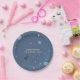 Ein Platz zum Thema Geburtstag Papier Platte mit Planeten, Sternen und eine Rakete im Cartoon-Stil auf einem blauen Hintergrund. Die Texte sind individuell anpassbar, sodass sie für jedes Party oder Abendessen verwendet werden können, aber sie eignen sich perfekt für die Geburtstagsfeier eines Kindes!