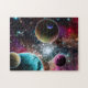 Eine farbenfrohe Szene, die eine Galaxie von Planeten und Sternen darstellt.
