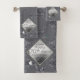Ich entwarf diese Handtücher, die ihrem 20. Hochzeitstag gewidmet sind, mit einem Hinweis auf die traditionellen Geschenke von Smaragden, Keramik und modernem Platin, um ihren Meilenstein in diesem wunderbaren, originellen Design zu markieren.