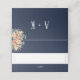 Dunkelblaue Hochzeitsstiftung, mit Aquarell-Aprikosen-Blume und Gartenblättern. Platz auf der Vorderseite, um den Gastnamen zu schreiben, und ein bearbeitbarer Bereich drinnen für Ihre individuelle Nachricht. Ein schlichtes und dennoch elegantes zeitgenössisches botanisches Design, inspiriert durch boho Vintagen Stil.