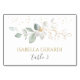 Elegante flache Platzkarte mit einer Darstellung des grünen und goldenen Blattwerks im Aquarellstil. Oben auf der Karte - Gold Effekt Konfetti. Sie können die Tischnummer an Ihre Anforderungen anpassen (2, 5...7...10...) - jedes Mal, wenn Sie eine neue Karte haben, und alle diese Karten in Ihren Warenkorb legen.