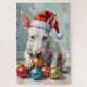 Bring some unique holiday cheer with this quirky Bull Terrier design! This expressive illustration features a lovable white Bull Terrier, sporting a festive Santa hat, playfully 'guarding' a pile of colorful Christmas ornaments. Perfect for Bull Terrier owners and fans who appreciate the breed's distinctive look and playful personality. Ideal for fun Christmas cards, unique apparel, and gifts that add a bold, cheerful, and slightly mischievous touch to the festive season.