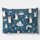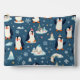 Das Bild ist ein Muster von niedlichen Cartoon Pinguinen auf blauem Hintergrund mit Schneeflocken. Die Pinguine sind in verschiedenen Posen dargestellt: stehend, winkend, mit Hüten und Schals tragen und mit Winterelementen wie Schneefräsen, Weihnachtsbäumen und Iglus interagieren. Die ästhetische Gestaltung ist fröhlich, festlich und kinderfreundlich.