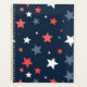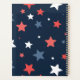 This bold and playful star pattern planner features a modern mix of red, white, and blue stars scattered across a deep navy background.