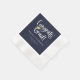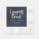 Glückwunsch Grad! Spielvolles weißes Drehbuch mit goldenem Graduiertenkappenakzent, Graduiertennapkins. Funktionen, marineblau blaue Hintergrundfarbe.