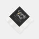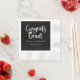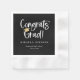Glückwunsch Grad! Spielvolles weißes Drehbuch mit goldenem Graduiertenkappenakzent, Graduiertennapkins. Funktionen, schwarzer Hintergrund.