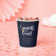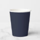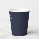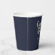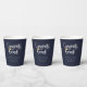 Glückwunsch Grad! Spielvolles weißes Skript mit goldenem Graduiertenkappenakzent, Graduierungsparty Papiertassen. Funktionen, marineblau blaue Hintergrundfarbe.