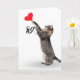 Gray tabby cat with red heart balloon for 89th birthday on white background.