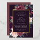 Das Abendessen mit der Probe ist mit einer lila bordeauxroten Marsala, Rosa und dustigen blauen Blumen, üppigem botanischem Blattwerk, Grün und Goldfolien geschmückt. Persönlich gestalten Sie Ihre Hochzeitsfeier mit Probe und Dinner-Details in modernen Schriften auf einem lila, dunklen Hintergrund.