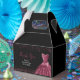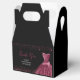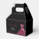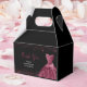 A beautiful plum purple themed elegant watercolor dress gown on a black background with faux glitter at the top and bottom of the favor box.