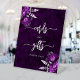 An elegant sign to welcome wedding guests to your Cards and Gifts table. The words "cards" and "gifts" appear in silver gray handwriting calligraphy with swashes at the beginning and end, with the words "thank you!" below in serif font. A pair of purple floral bouquets set off with silver faux foil foliage appear in two corners, on a background image of deep plum purple watercolor agate. See our collection for matching wedding invitation suite and day-of stationery.