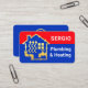 A red and blue (signifying heat and water) layered cover features a gold pipe-faucet home frame design. At the top corner lies your prestigious name with the business name "Plumbing & Heating" which you can change, in the blue layer.