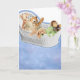 This is a Gender Neutral greeting card featuring an addorable display of plush toy animals all nestled in a white wicker moses basket! Wonderful design for baby announcement, or baby shower invitation.