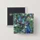 Ein herrlicher Pfau lockert seine jeweled Federn auf, die in den Blues und in den Grüntönen iredescent sind. Knopf, Button.