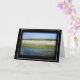 Eine leere Karte mit originaler Collage aus Foto, die eine surreale Szene aus Strand, schneebedeckten Kaskadengebirge, Meer und Himmel darstellt.