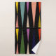 Dieses Handtuch-Set hat ein Badehandtuch mit einem modernen Design aus Dreiecken, die sich gegenseitig gegenüber wiederholen, das sich über das Design, ein gelbes Waschlappen und ein lila Handtuch.