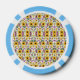 Poker chips with a vibrant floral pattern featuring yellow, pink, and purple flowers. They have a bold black and white border, conveying a playful tone.