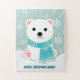 Kindermädchen aus der Arktis Das Puzzle Weihnachtsjigsaw zeigt einen niedlichen Eisbärenkub, der in einem Winterschal im Schnee mit Schneeflocken gebündelt ist. Sie können den Namen und den Gruß für ein einzigartiges Urlaubsgeschenk für einen Jungen oder ein Mädchen personalisieren. Original-Kunstwerk KL Stock.