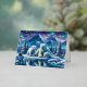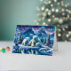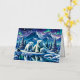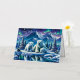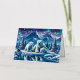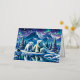 Eine Mutter, ein Eisbär und ihre beiden Jungs sitzen auf einer schneebedeckten Bank vor einem gefrorenen See. Schneebedeckte Kiefernbäume bilden den Hintergrund unter einem Nachthimmel voller Nordlichter. Mehrere kleine Vögel Erholung auf den schneebedeckten Ufern des Sees. Die Reflektion der Bären und des Polarborealis strahlt im Wasser.