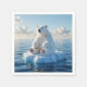 A polar bear sits calmly on a small piece of floating ice, surrounded by a vast, tranquil ocean under a clear blue sky