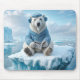 Ein Eisbär, der einen blauen Pullover, Ohrmuffe und einen Eisberg trägt, während er eine Zeitung mit dem Titel "Polar News" hält.
