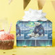 A polar bear, wearing a colorful sweater, sits on an ice floe as the aurora borealis illuminates the sky, creating a magical backdrop