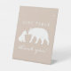 Winter Baby Dusche Geschenktisch Thema mit Illustration von Baby und Mama Eisbär umgeben von Schnee über rosa Hintergrund mit weißem Text.