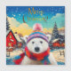 Ein Polarbär mit Weihnachtsmannmütze und Schal mit fallendem Schnee. Frohe Weihnachtsgrüße.